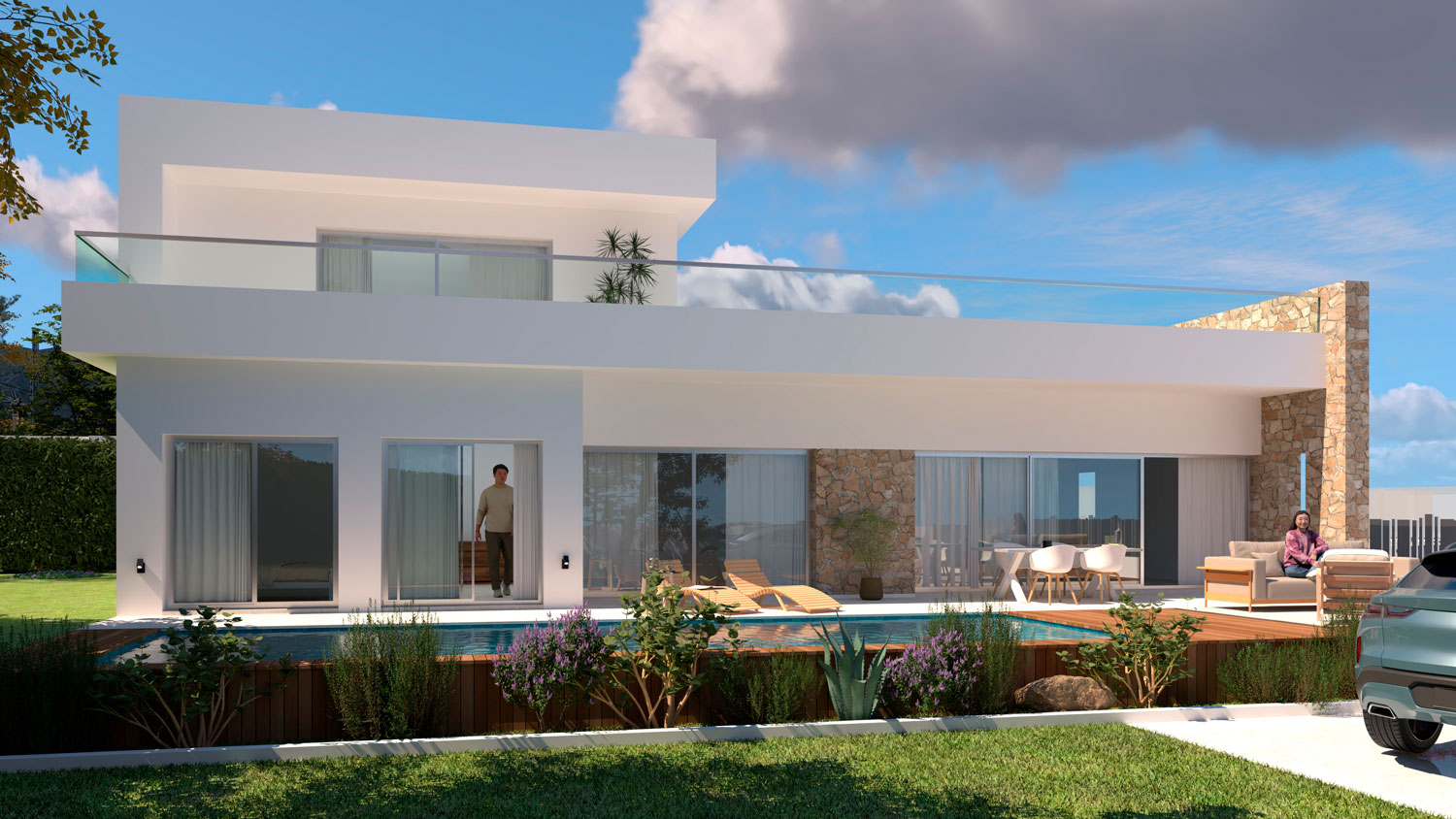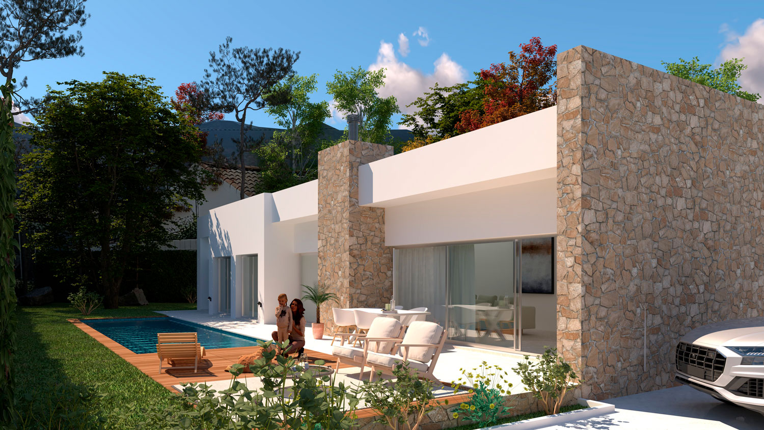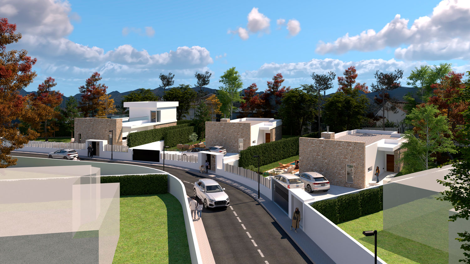 Un refugio moderno entre la luz y la naturaleza. En esta pequeña urbanización se alzan tres villas únicas que reinterpretan la esencia mediterránea. Sus muros blancos y la nobleza de la piedra dialogan con el verde del entorno, creando una arquitectura serena y atemporal.